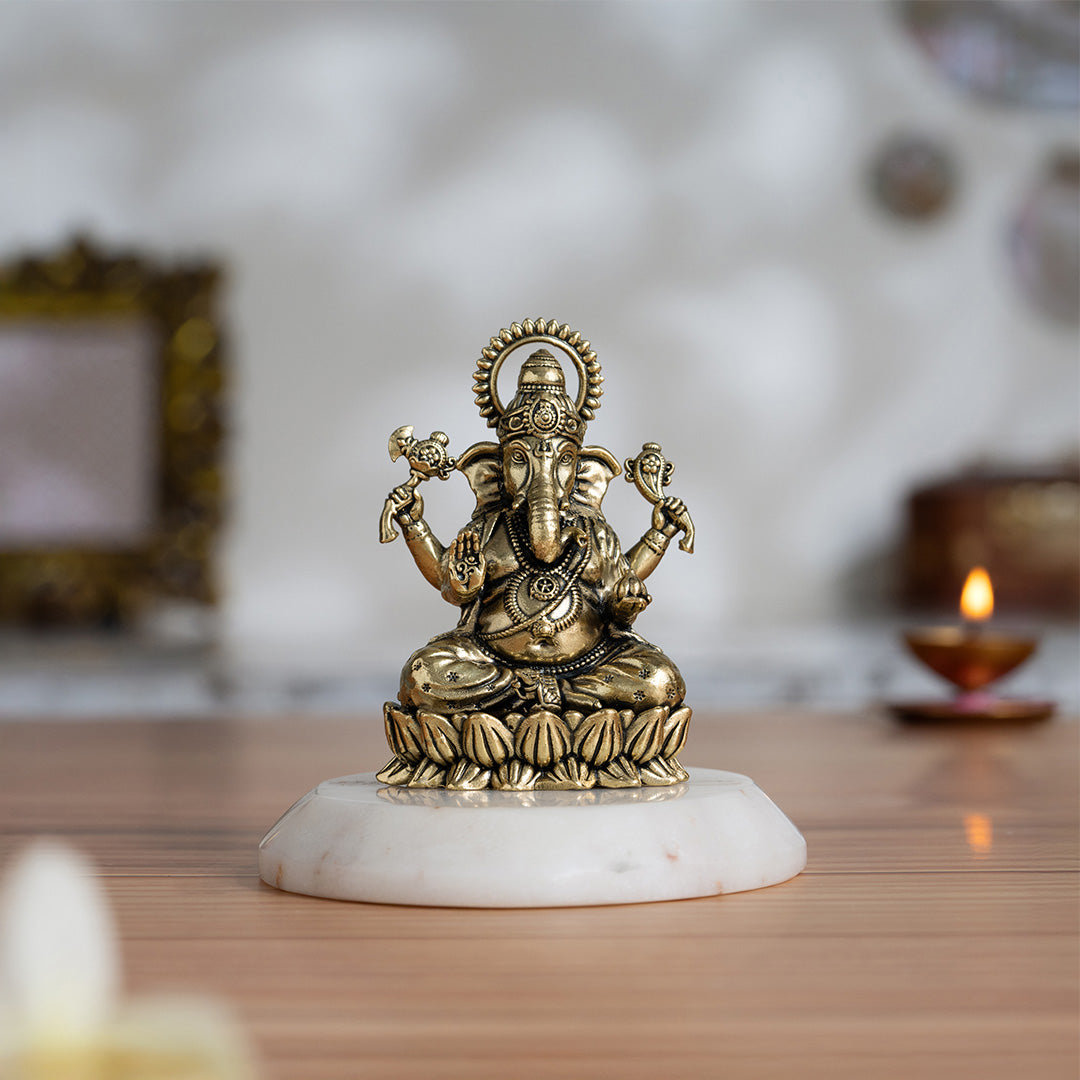 Brass Left-Trunk Ganesha Murti Sitting On Lotus (3 Inch)