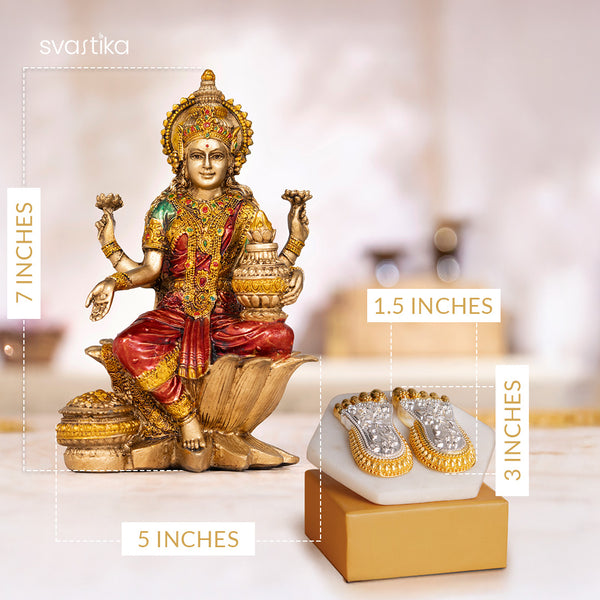 Goddess Lakshmi Antique Idol (7 Inch) with Maa Lakshmi's Charan Paduka - Gold & Silver Plated (3 Inch) - Combo
