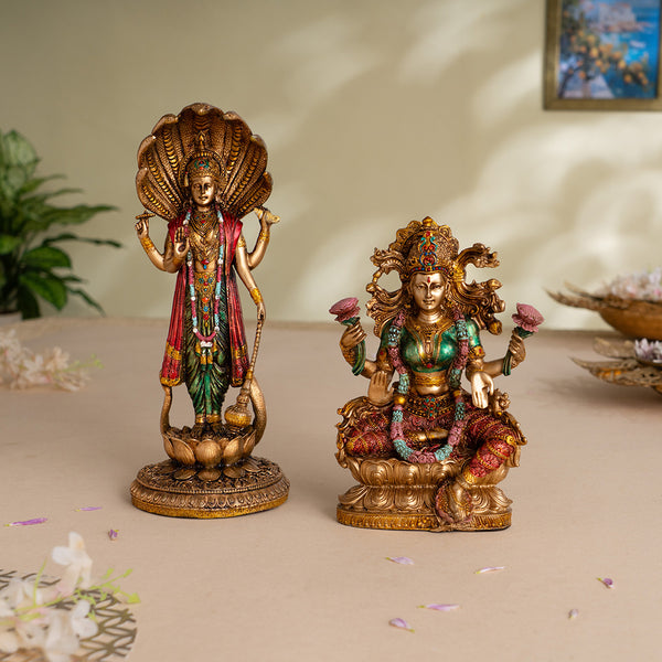 Lord Vishnu Standing Antique Idol (12 Inch) with Goddess Lakshmi Maa Antique Murti (10 Inch) - Combo