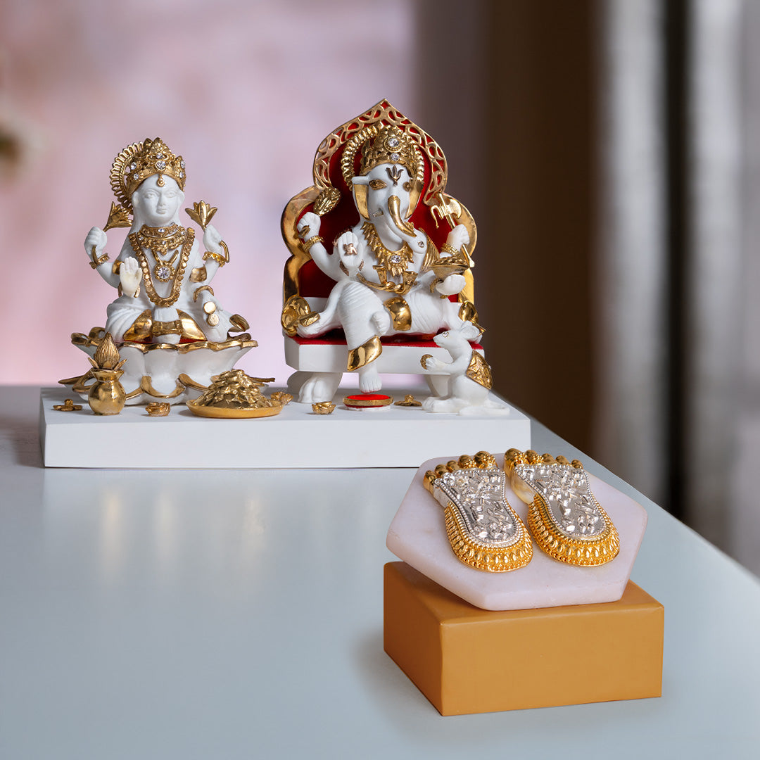 Meticulously detailed, this Lord Vinayaka idol alongside Laxmi Murti radiates purity and opulence, making it one of the best housewarming gifts or wedding gifts for couples.