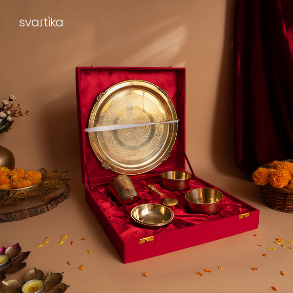 Elevate your home space with the Svastika Luxury Bhog Thali Set, a 12.5 Inch masterpiece combining traditional craftsmanship and contemporary elegance - perfect for special occasion gifting.