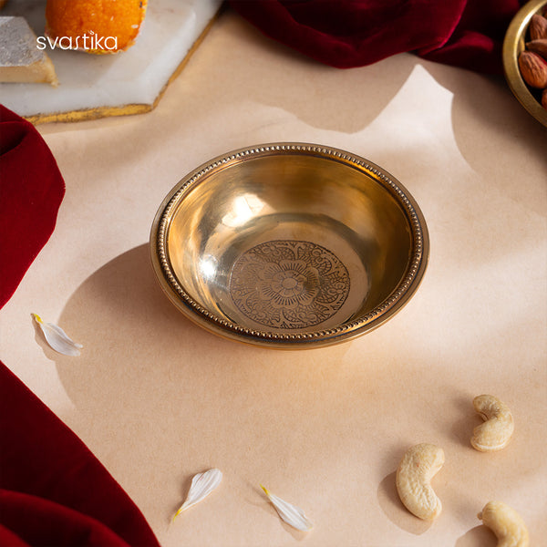 Embrace traditional craftsmanship and elevate dining with the Svastika Floral Engraved Brass Thali Set | Ideal for Gifting & Occasions. This exquisite brass thali set blends functionality, elegance and cultural significance - a treasured home addition or thoughtful gift.