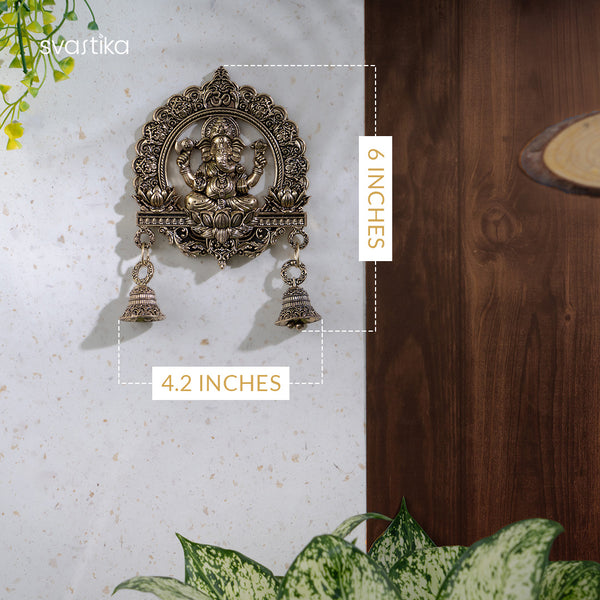 This finely crafted Brass Ganesh Wall Hanging with Bells brings auspicious energy and spiritual calm into your home through detailed artistry and traditional design. The antique brass finish highlights Lord Ganesha’s serene form, while the softly suspended bells add a subtle devotional sound that enriches the atmosphere.
