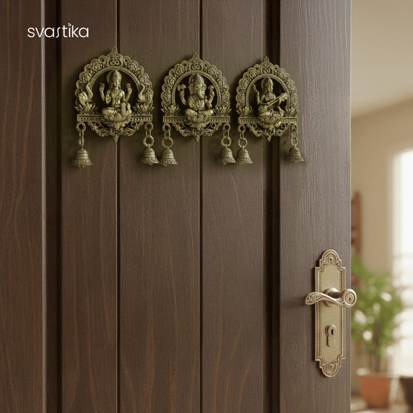 This thoughtfully designed brass wall hanging brings together Lord Ganesha, Goddess Lakshmi, and Goddess Saraswati in a harmonious form. Crafted with fine detailing, this brass lakshmi ganesh saraswati wall hanging with bells symbolises wisdom, prosperity, and learning. The antique brass finish and softly hanging bells add a calm, devotional presence to any space.