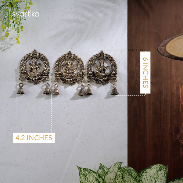 Brass Lakshmi Ganesh Saraswati Wall Hanging With Bells