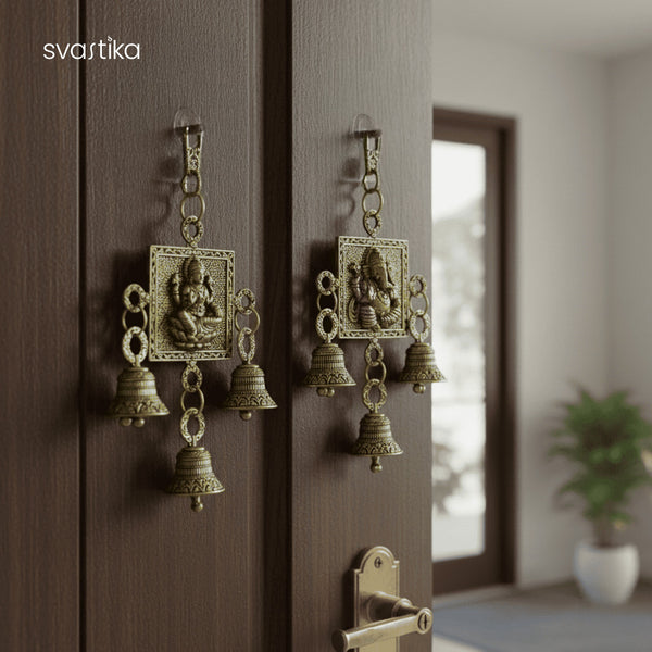 Pair this ganesh laxmi wall hanging with bells with brass diyas on either side of the entrance. Add a brass urli or incense burner nearby to create a warm, welcoming, and spiritually uplifting setup.