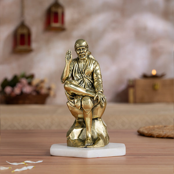 Inspired by the revered saint of Shirdi, Svastika presents a finely crafted brass Sai Baba murti, depicting him seated on a rock with one hand raised in blessing a symbol of his eternal compassion and wisdom.