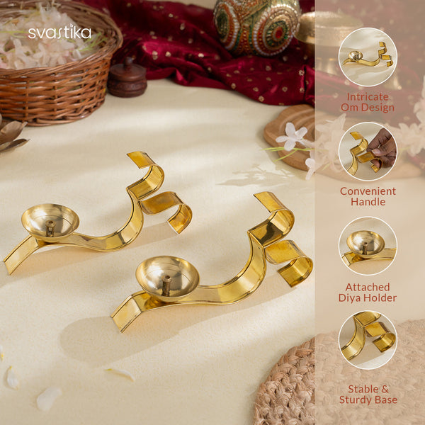 OM ૐ Brass Oil Lamp Diya with Handle - Set of 2 (3 Inch)