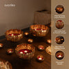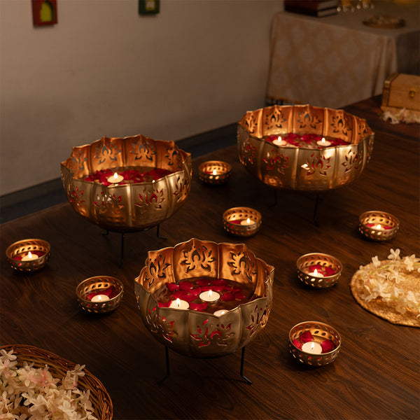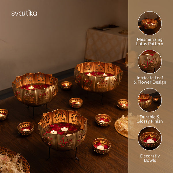 The set features 3 main lotus urli bowls and 7 smaller urli bowls, ideal for versatile urli decoration. The intricate leaf and flower designs add a touch of elegance to your home decor, making them ideal for a range of uses—from stunning centerpieces to floating candle holders and floral decorations.