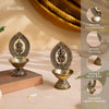 This beautifully handcrafted Ganesh Lakshmi Brass Diya Set features intricately sculpted idols of Lord Ganesha and Goddess Lakshmi, seated gracefully atop a traditional diya base. Made in solid brass and finished with an antique polish, this elegant brass diya for pooja not only lights up your space but also radiates divine blessings and timeless grace.