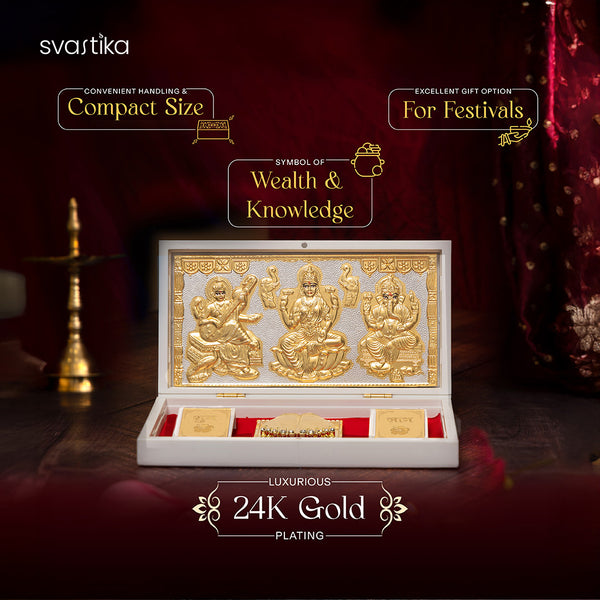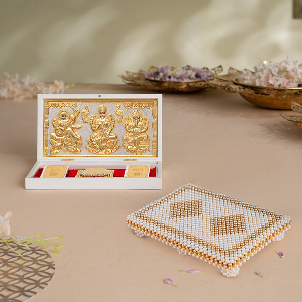 Ganesh Lakshmi Saraswati Pocket Temple - Gold Coated (Small) with White & Gold Pearl Pooja Chowki (9 Inch) - Combo