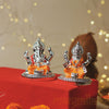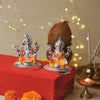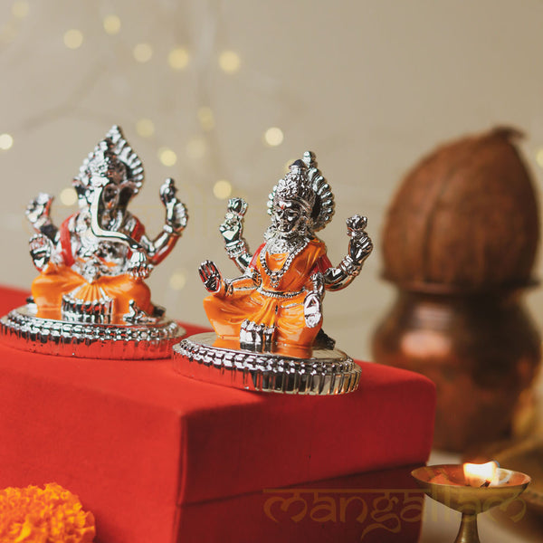 Celebrate divine harmony with this finely crafted Laxmi Ganesh Murti, featuring the beloved duo of Lord Ganesha and Goddess Lakshmi seated together decorated in a saffron apparel, This Murti is plated in shining silver, with a sturdy yet traditional base.