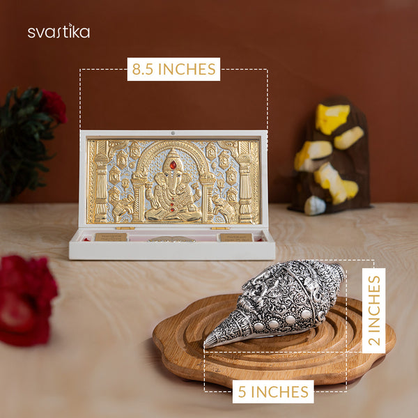 Ganesh Shankh (Conch) - Silver Plated (5 Inch) with Ganesha Pocket Temple - Gold Plated (Small) - Combo