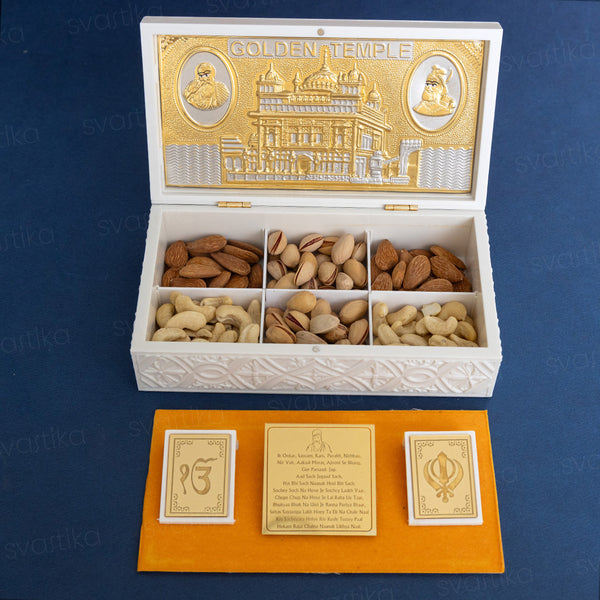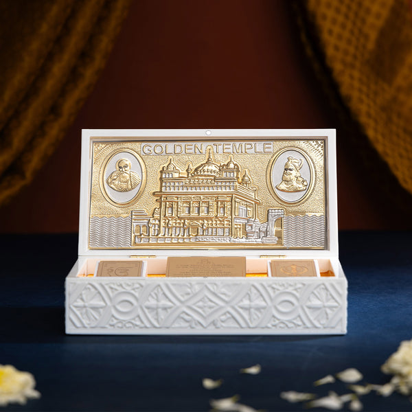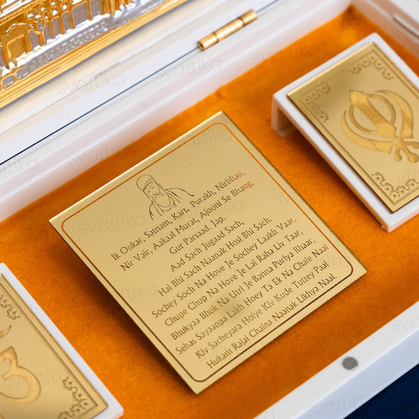 As you open this priceless Pocket Temple, you have this alluring imprint of the Golden Temple that is covered with 24 Karat Gold. On the other side you have 3 small mementos that encompass spiritual teaching of the Sikh community.
