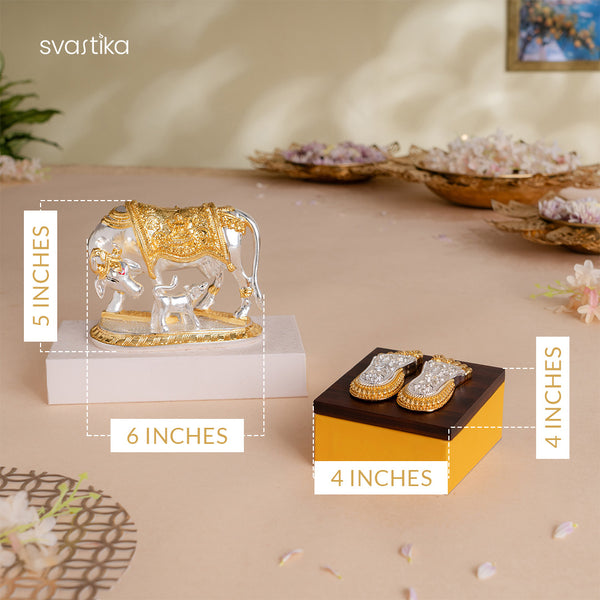 Invite divine abundance and spiritual harmony into your home with this auspicious combo featuring a Kamdhenu Cow with Calf Idol (5 inch) and Maa Lakshmi’s Charan Paduka placed on a beautifully crafted base both in radiant gold and silver plating.