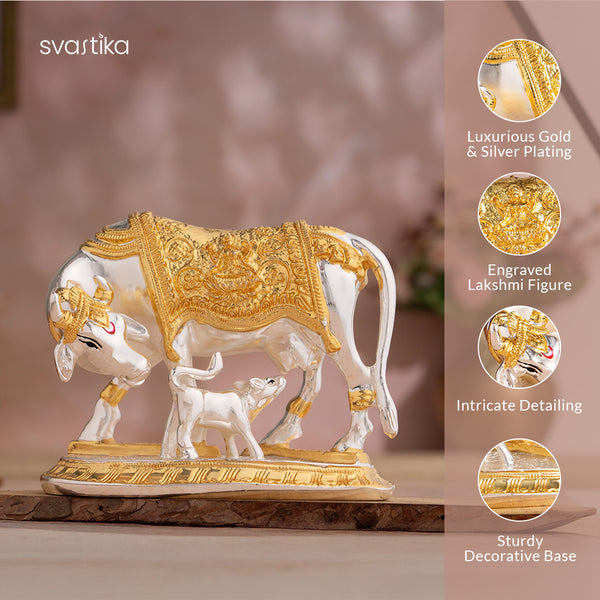Kamdhenu Cow with Calf Idol - Gold & Silver Plated (5 Inch) with Maa Lakshmi's Charan Paduka on Elegant Base - Gold & Silver Plated - Combo