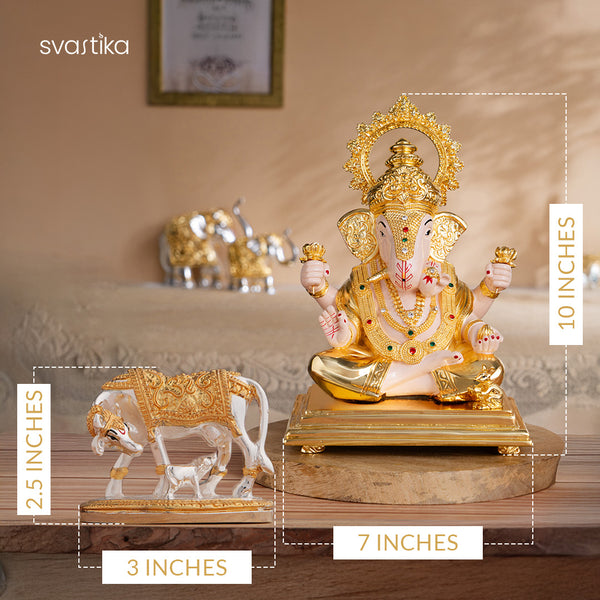 Kamdhenu Cow with Calf Idol - Gold & Silver Plated (2.5 Inch) & Dagdusheth Halwai Ganpati Murti - Gold Plated (10 Inch) – Combo