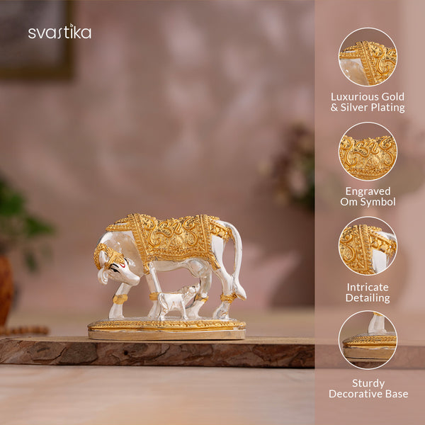 The Kamdhenu Cow with Calf, elegantly finished in gold and silver plating, is revered in Hindu tradition as the mother of all cows and a symbol of nurturing energy, wealth, and wish-fulfillment. It is a Vastu-positive idol that enhances spiritual and material growth.