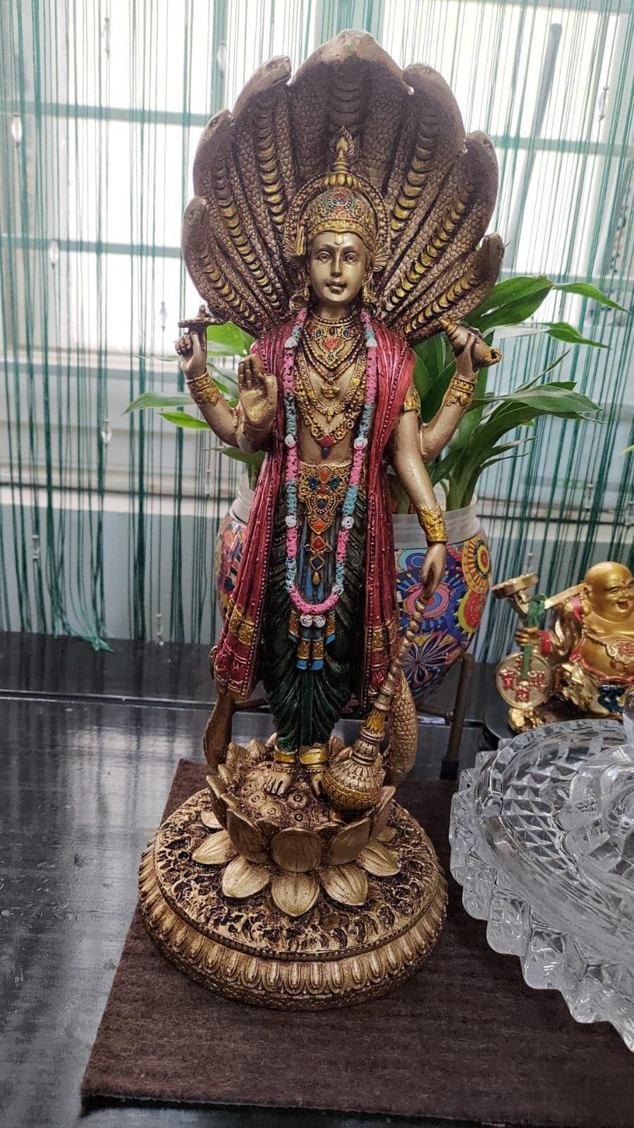 Crafted from premium polyresin, every intricate detail captures the essence of Lord Vishnu's divine form, from the confident posture to the serene facial expression.