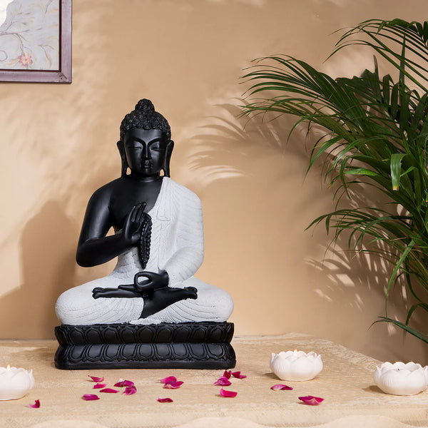 With a Height of 17 inches and a Lengith of 11 inches, this Buddha black statue is an ideal decor piece for your living room, meditation area, or office. Its monochrome black-and-white design adds a modern yet spiritual touch, blending effortlessly with any decor theme.