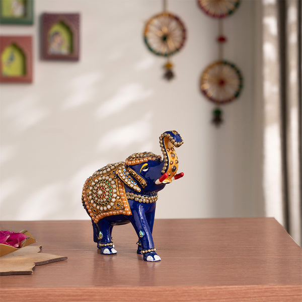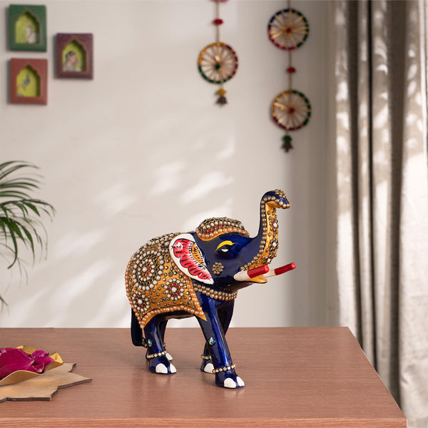 Add a touch of elegance and traditional charm to your space with this beautifully crafted blue elephant statue. This compact elephant idol is perfect for smaller spaces like shelves, desks, or as part of your home entrance decor.
