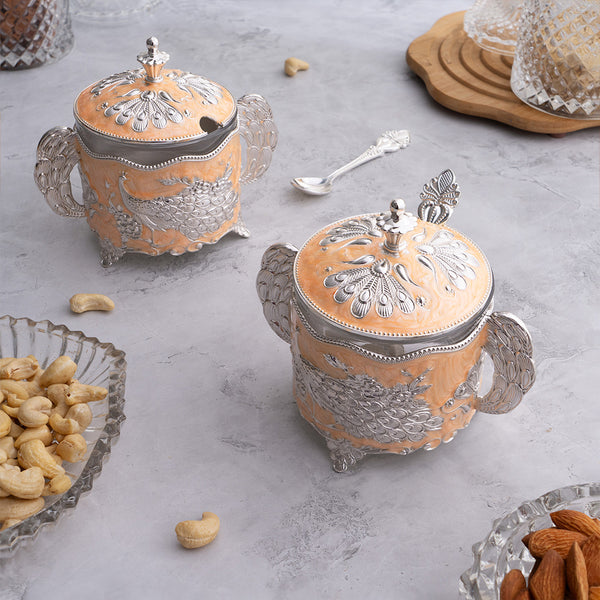 Add a touch of elegance to your home with our Peach Enamel German Silver Dry Fruit Container Peacock Design with spoons, a luxurious piece perfect for daily and special occasions. This beautifully crafted piece serves as a premium dry fruit container and doubles up as a charming mukhwas box with spoon, combining utility with regal sophistication.