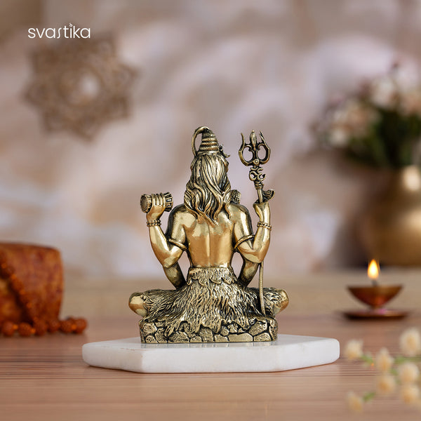 Expertly crafted, the brass statue captures intricate details from the Shivalingam-adorned jata mukut crown to the knee-length jatajuti dreadlocks. This Mahadev murti presents the union of yogic insight and destructive capability as one regenerative force.