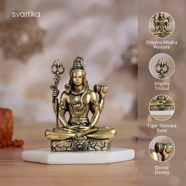 Experience the profound stillness of Bholenath with this exquisite Brass Lord Shiva Meditating Idol. The 4" Stunning Murti depicts the four-armed Mahadev absorbed in deep meditation upon a tiger rug.