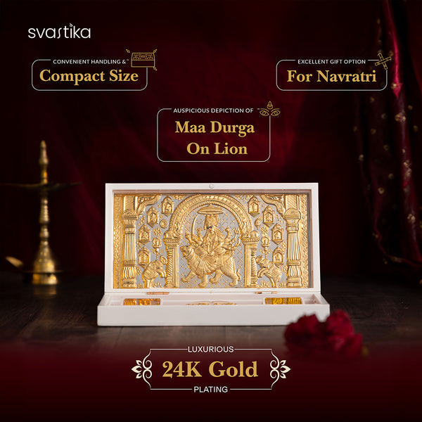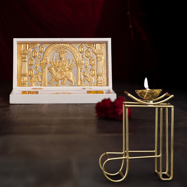 Svastika Nav Durga Pocket Temple - Gold Coated (Small) with Brass Maa Symbol Diya (5 Inch) - Combo