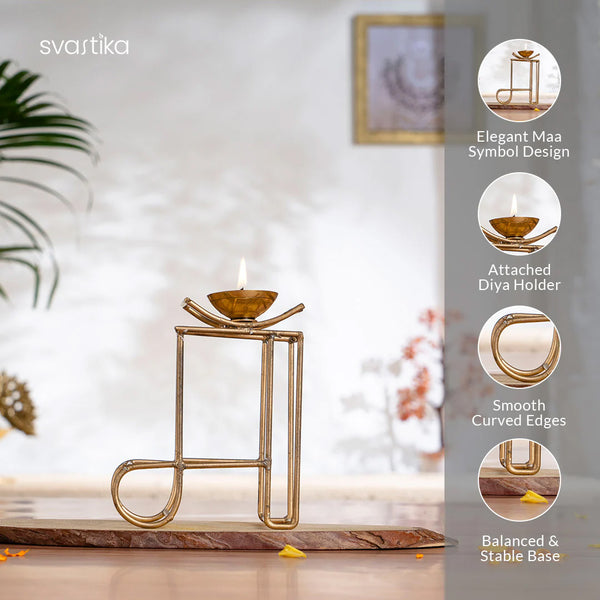 Accompanying it is the Maa Shaped Diya, a stunning brass-finished diya with an artistic design that radiates spiritual charm. Its elevated stand adds a touch of elegance, making it ideal for daily pooja, aarti, and festive rituals.