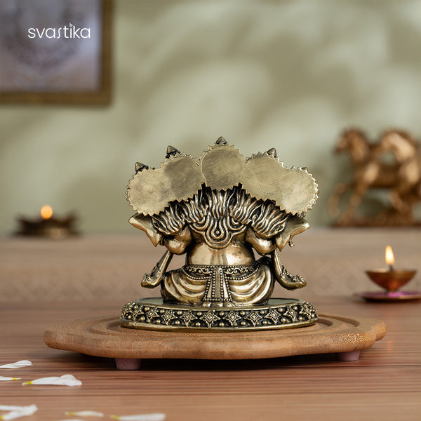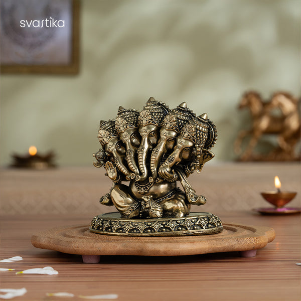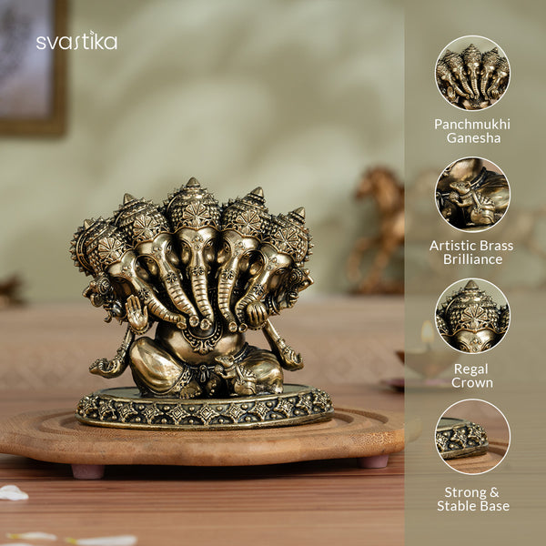 Discover our 4.5" Brass Panchamukhi Ganesha Idol, a unique Lord Ganesha murti perfect for your sacred space. This brass Ganesh idol, ideal as a Ganesh idol for a pooja room or office desk, showcases the deity with five symbolic heads.