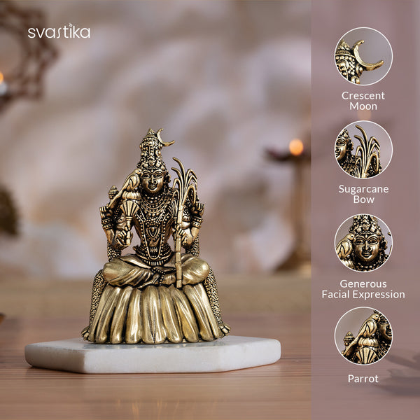 Crafted with exceptional detail, the Raja Rajeshwari Idol features the goddess holding a parrot and sugarcane, representing her wisdom, fertility, and control over desires.
