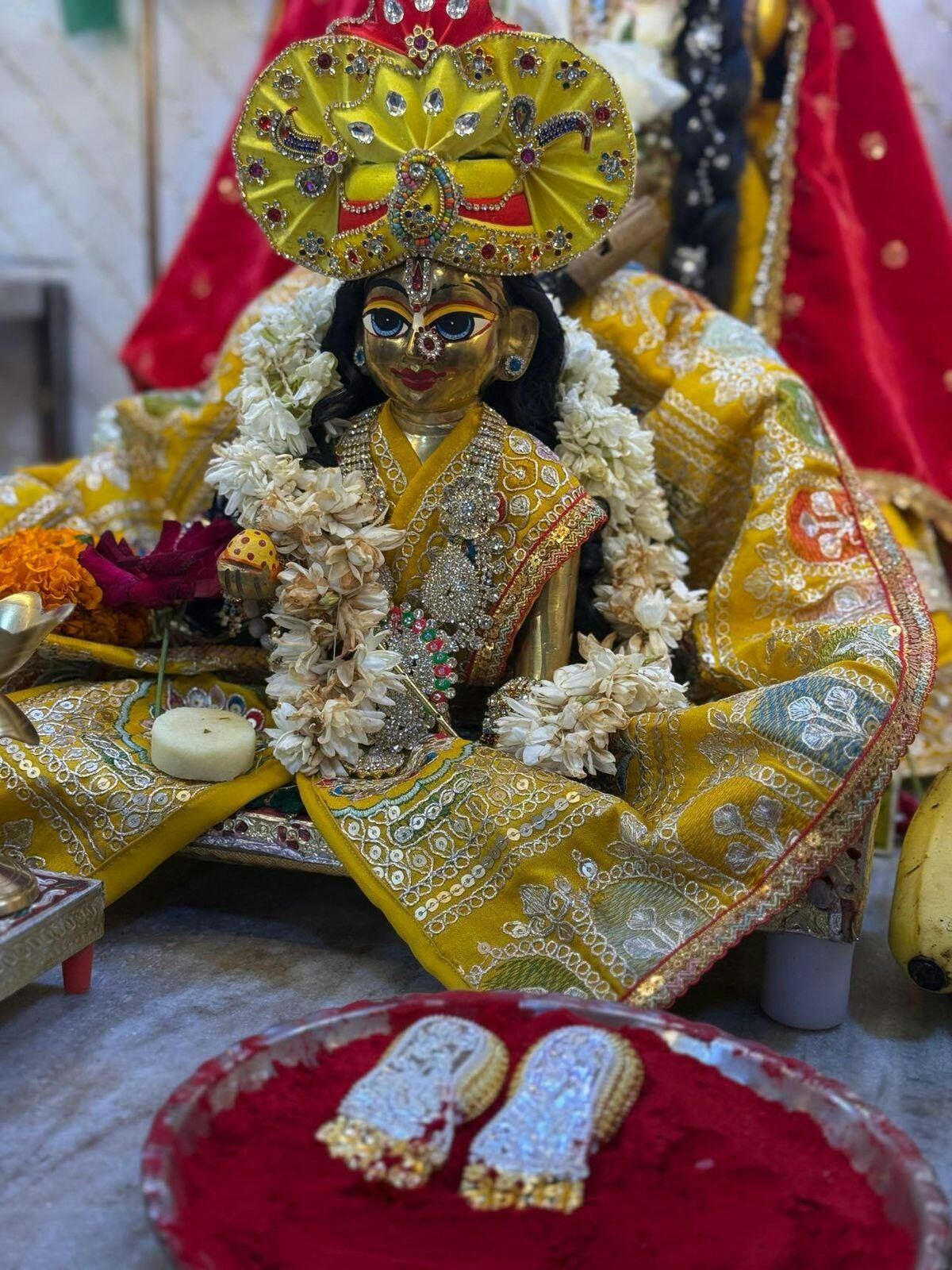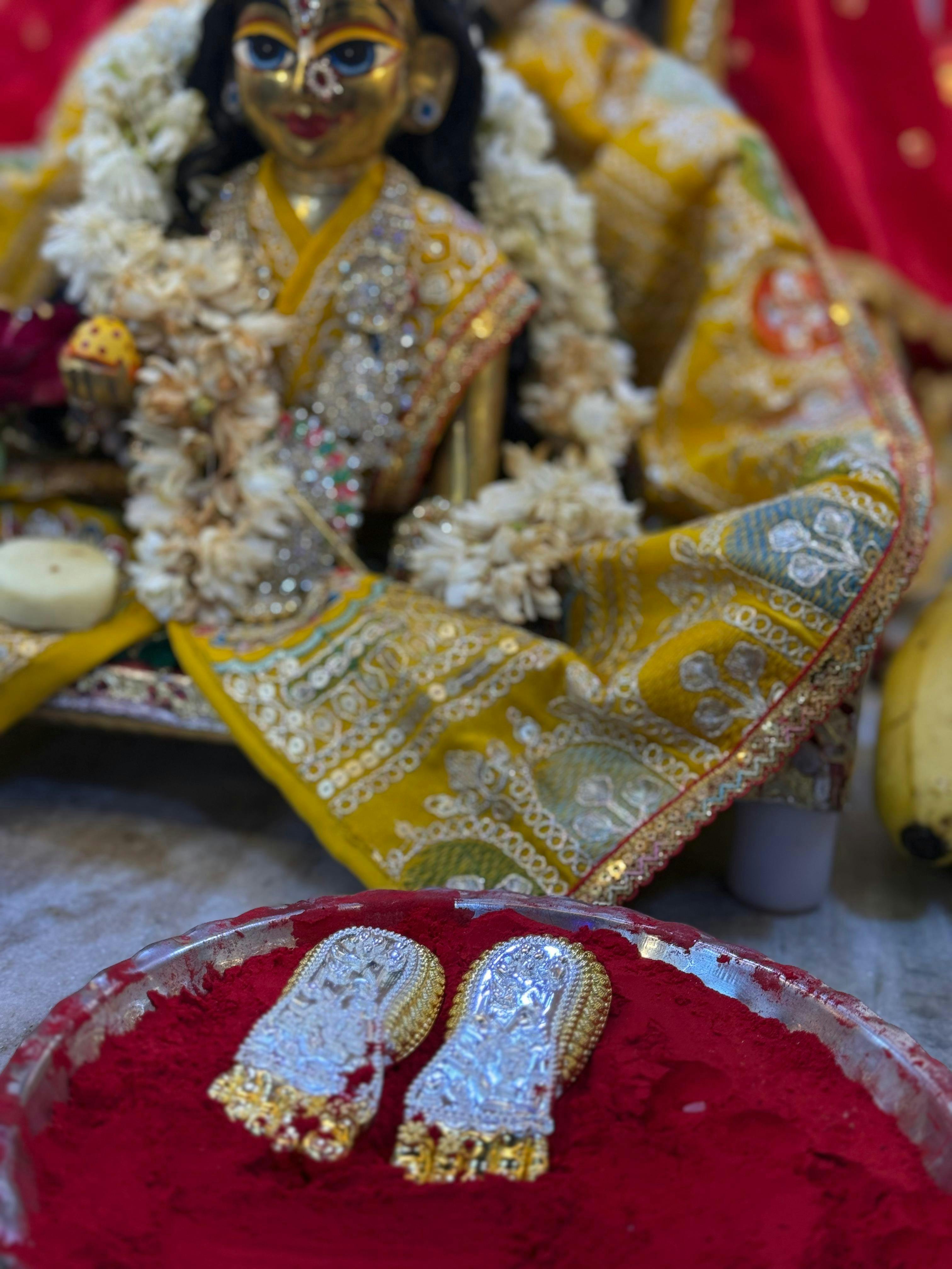 Crafted with fine detail, this timeless piece of spiritual art radiates elegance with its luxurious 24k gold plating and 999 high-grade silver finish. Adorned with delicate gold-plated anklets, each element reflects the skilled artistry that brings out the sacred beauty of Maa Lakshmi’s blessings.
