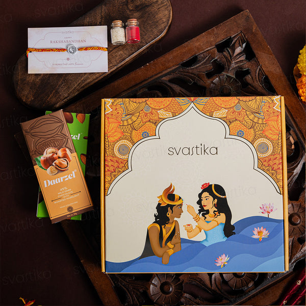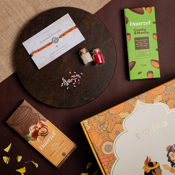 Svastika's Silver EK Onkar Rakhi Hamper is the perfect surprise hamper for your brothers, this year! It’s a beautiful fusion of a sacred symbol, luxury, and heartfelt tradition. Make this Raksha Bandhan truly special & blend reverence with indulgence using this chocolate hamper for rakhi