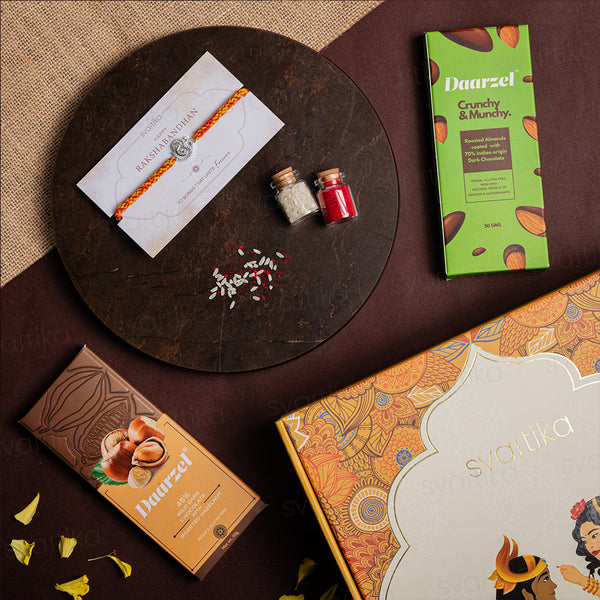 - Vegan Roasted Almond Dark Chocolate Nutties: Second in this rakhi and chocolates combo is a rich flavor of 70% dark chocolate glazed over premium roasted almonds.