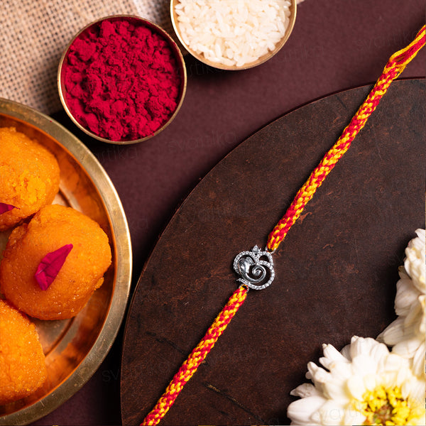 - 925 Silver Om Ganesha Centerpiece Rakhi: A handwoven rakhi with an intricately designed silver Om Ganesha centerpiece. The Om Ganesha design symbolizes wisdom, prosperity, and protection, making it a perfect emblem of your bond.