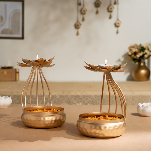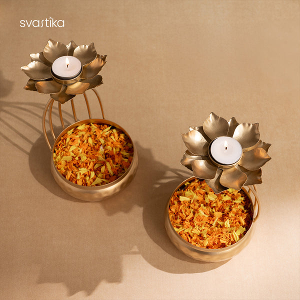 The classic rounded urli bowls feature intricate lotus motifs adorning the tealight holders, symbolizing spiritual enlightenment. Manifest abundance by filling the bowls with water and flowers or lighting the candles for a warm, welcoming glow.