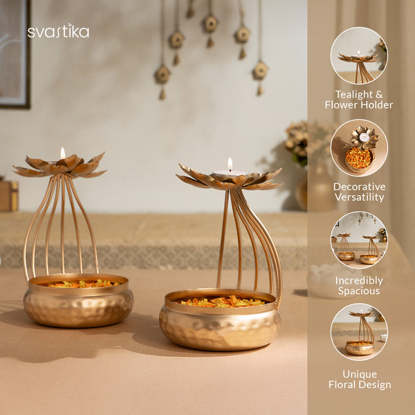 Elevate your space with this stunning set of 2 - Urli Bowls and Flower Candle Holders, a harmonious blend of tradition and versatility.