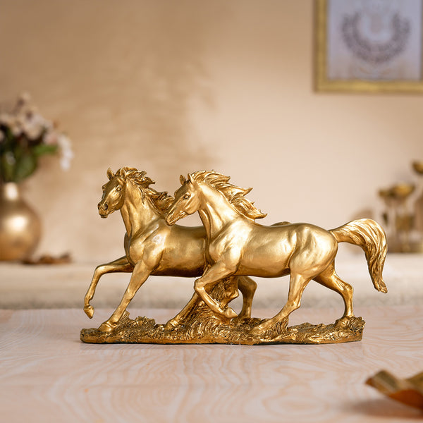 Svastika's Vintage Running Horse Statue is a magnificent piece of art that will add Opulence and grace to your home or office. Expertly crafted using premium Poly-resin material, this statue features a beautiful design of two galloping horses in motion