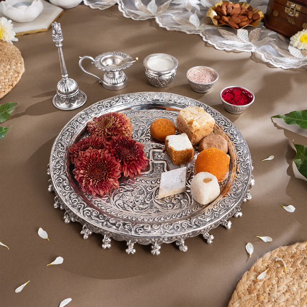 - Swastik Engraved Silver Pooja Thali: The stunning centerpiece adorned with traditional Svastika prosperity symbols in elegant silver plating.
